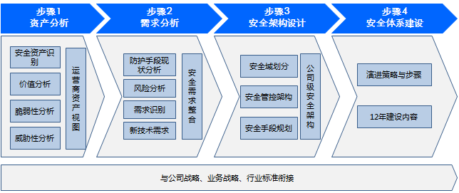 佰兴技术通过资产分析、需求分析、安全架构设计、安全体系建设四个步骤,实现安全规划目标。